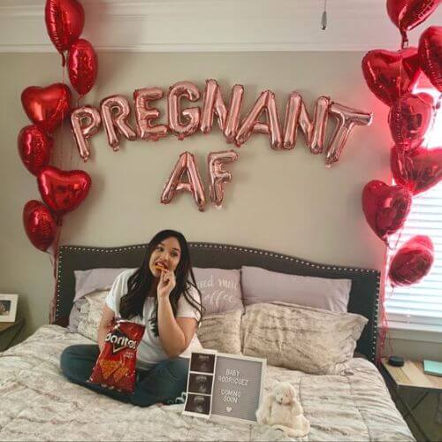 The combination of the ultrasound photo, pregnancy test, and balloons ties in beautifully with a Valentine’s Day announcement.